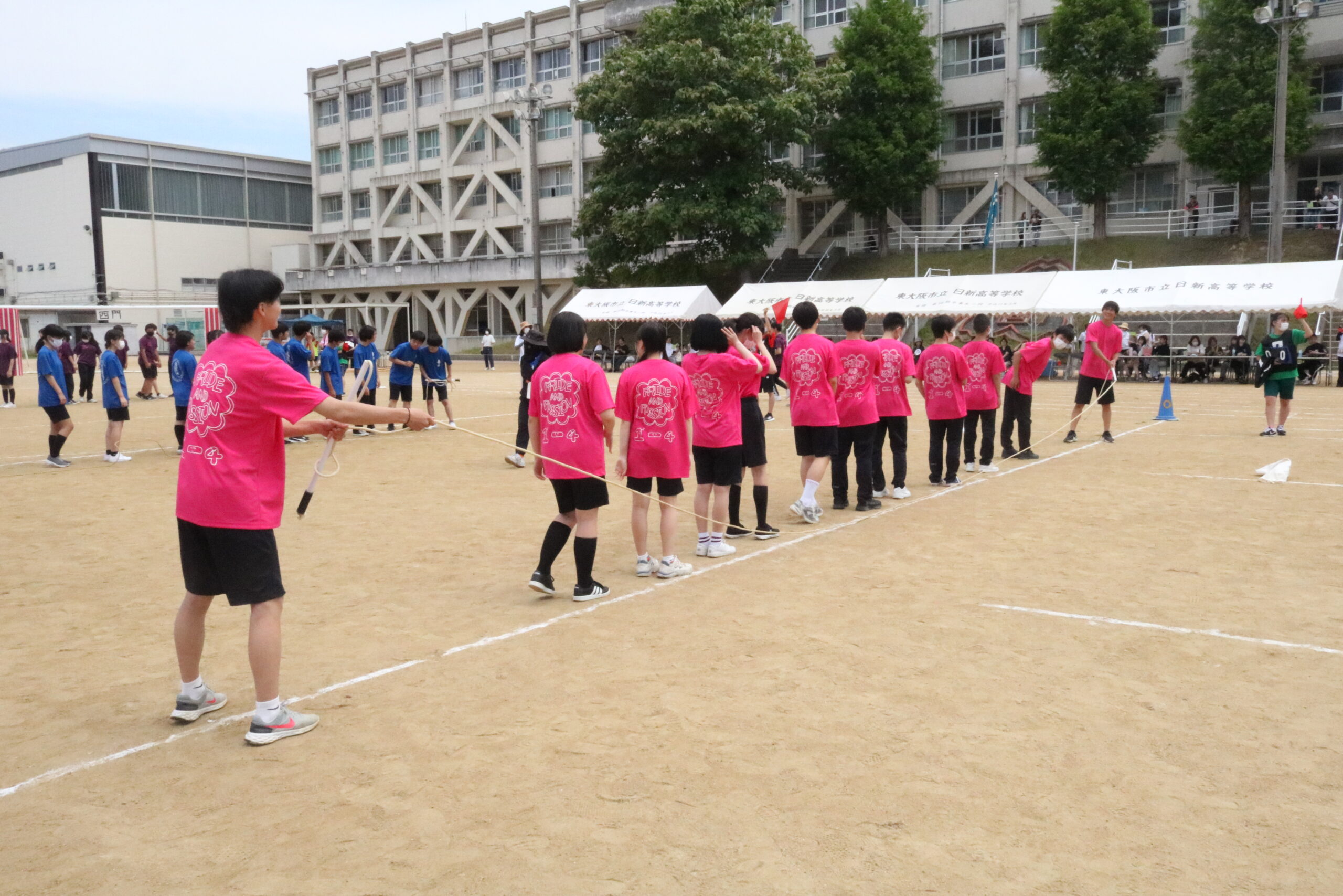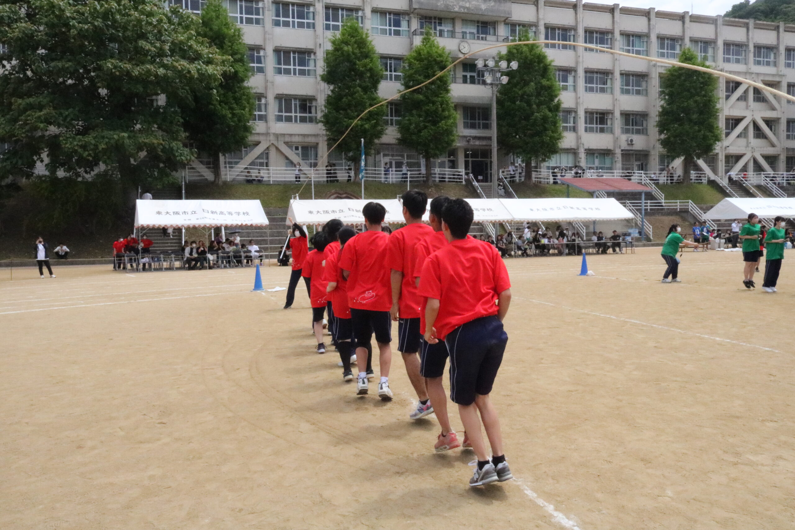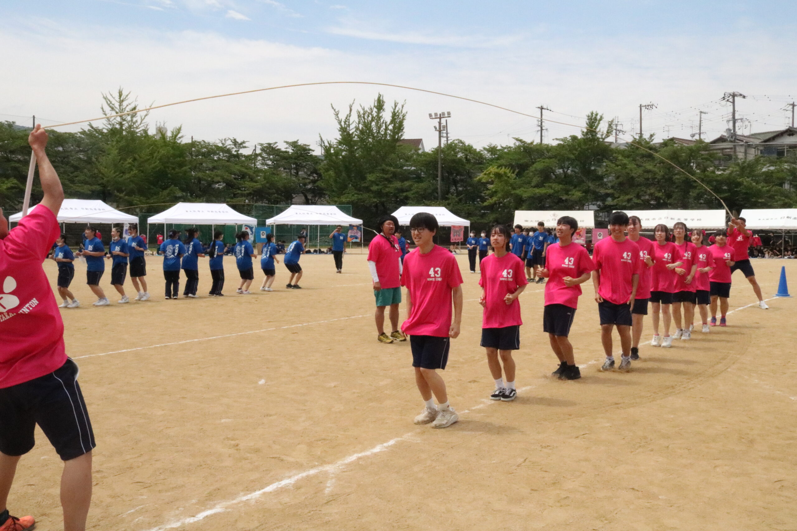 午前の部は短距離走・団対抗日新鉄人リレー・大縄跳び・棒引き(女子)・騎馬戦(男子)・運動部対抗リレーが実施されました。