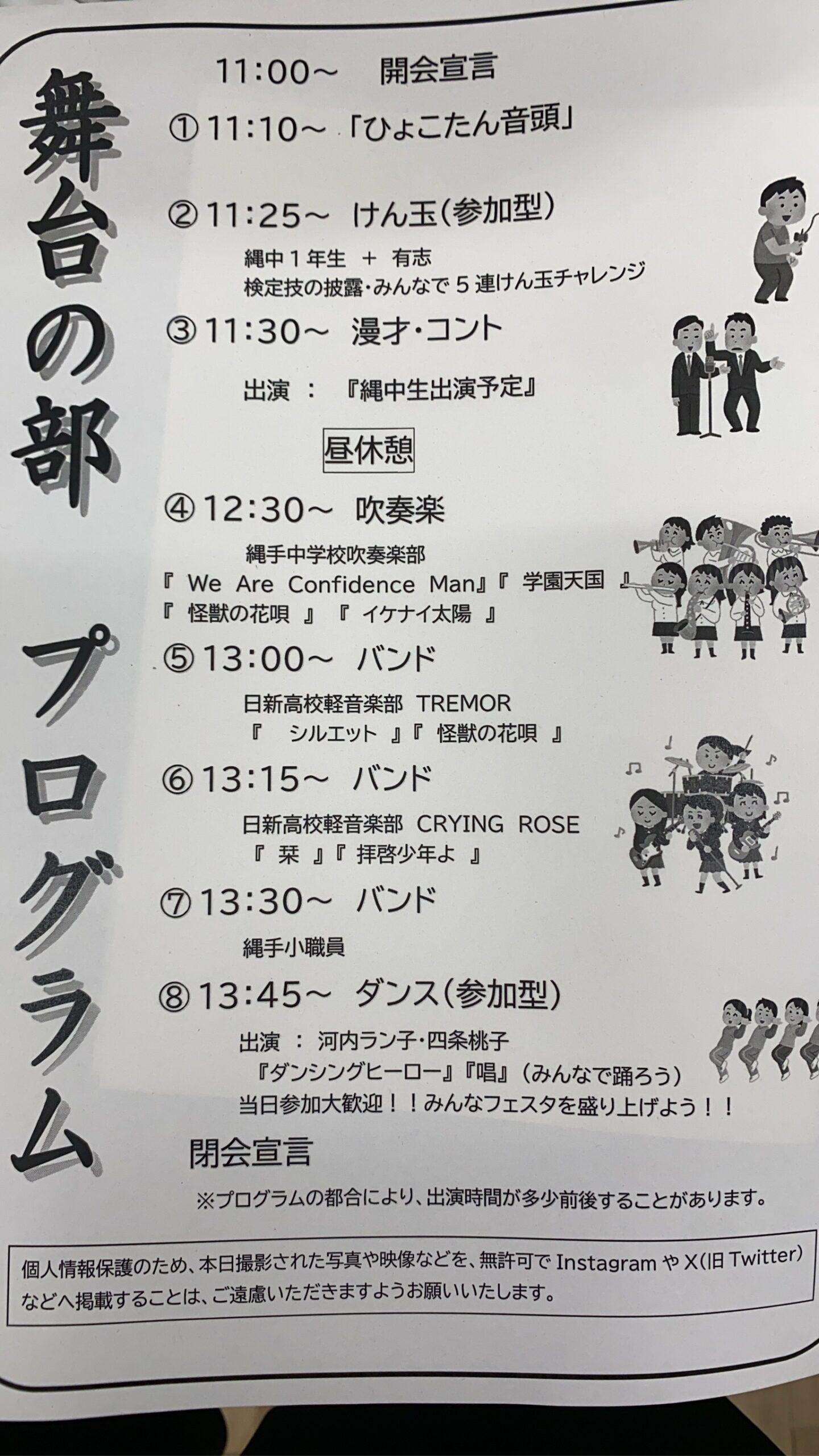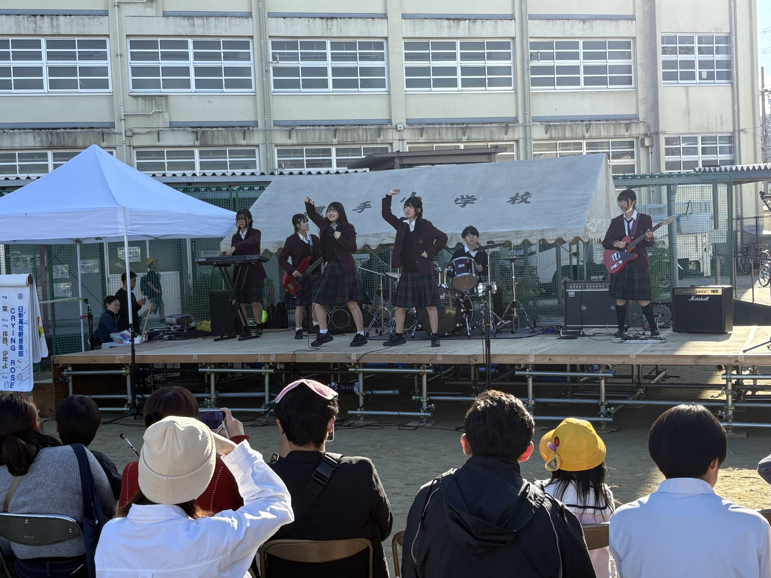 この日も、インフルによる学級閉鎖の影響で出演する予定の部員が出れなくなり、急遽メンバーを変更しての演奏となったのであまりいい演奏ではなかったかもわかりませんが、それでも一生懸命、精一杯の演奏を行いました!縄手小学校のグランドの野外のステージで、晴天に恵まれ、たくさんの方々の前でライブができてとても楽しかったです!また、日新高校在学中の保護者の方が、出演者にチュロスをお馳走してくれたり、楽しいことがたくさんあってとてもいい一日になりました。