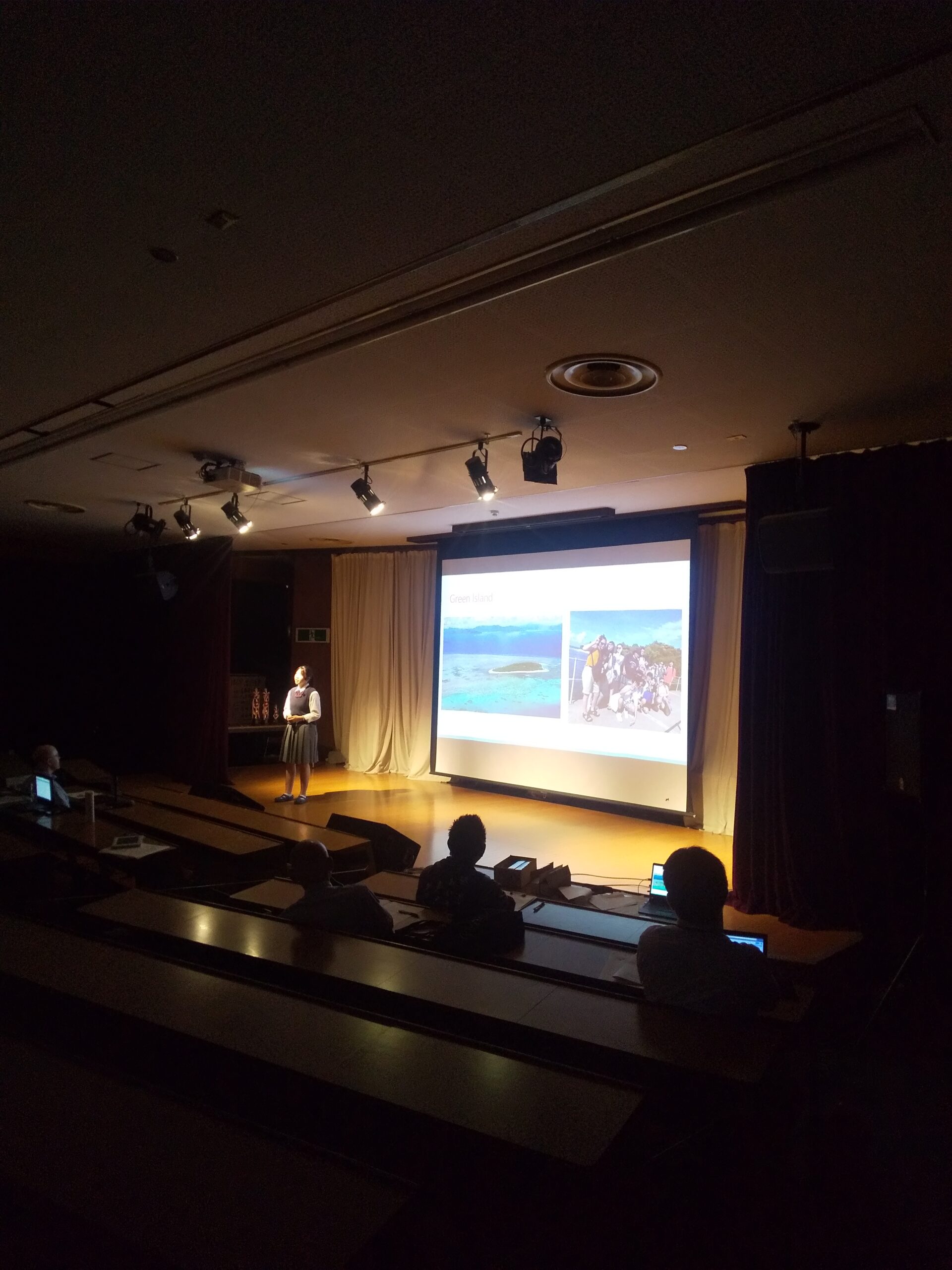 中学生の発表に続いて、本校3年英語科生徒の3-2宮本瑠さん、本井絢香さんがこの3月に行ったオーストラリア公費留学について英語でプレゼンテーションを行いました。二人とも笑顔で自信を持って発表してくれました。