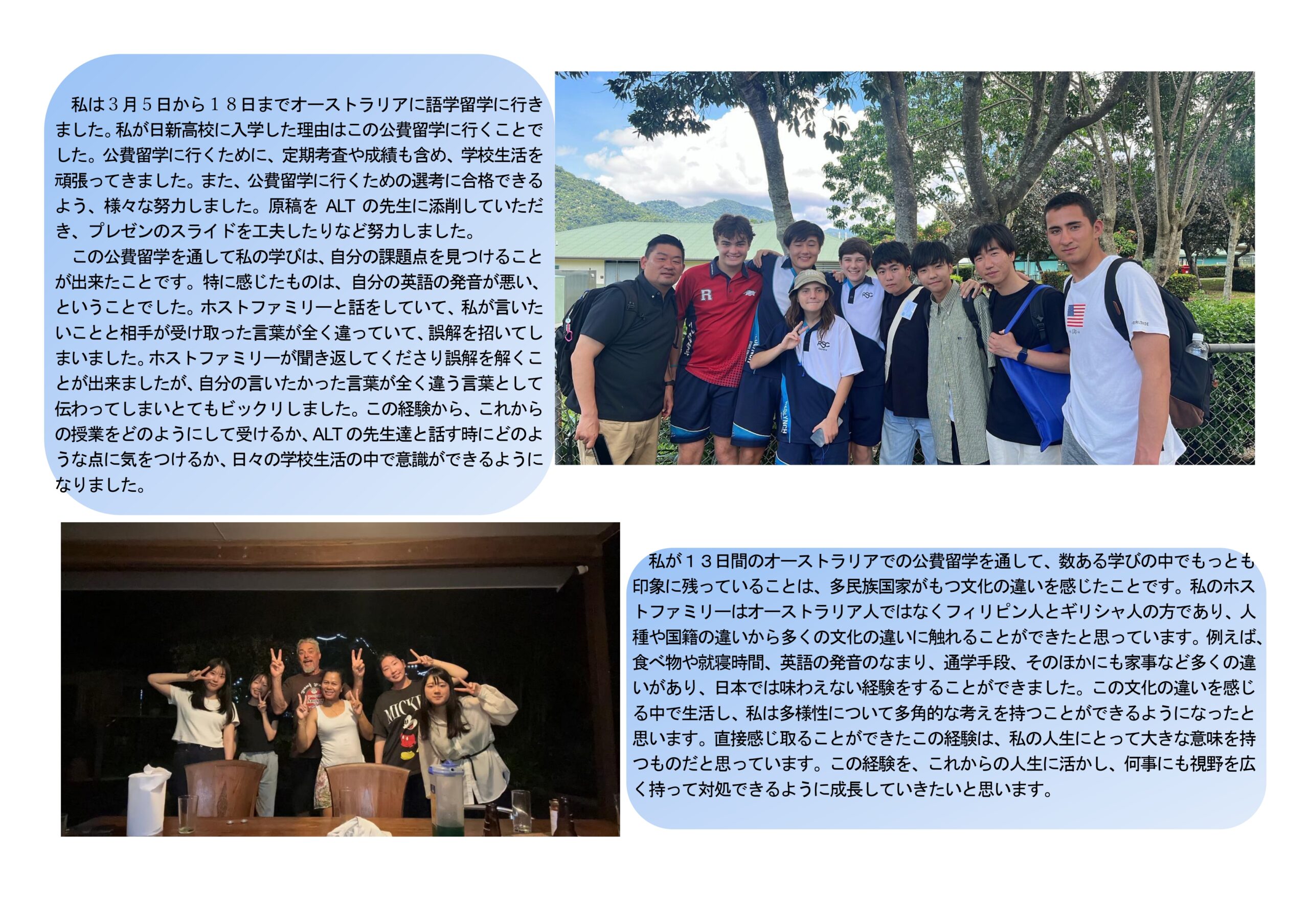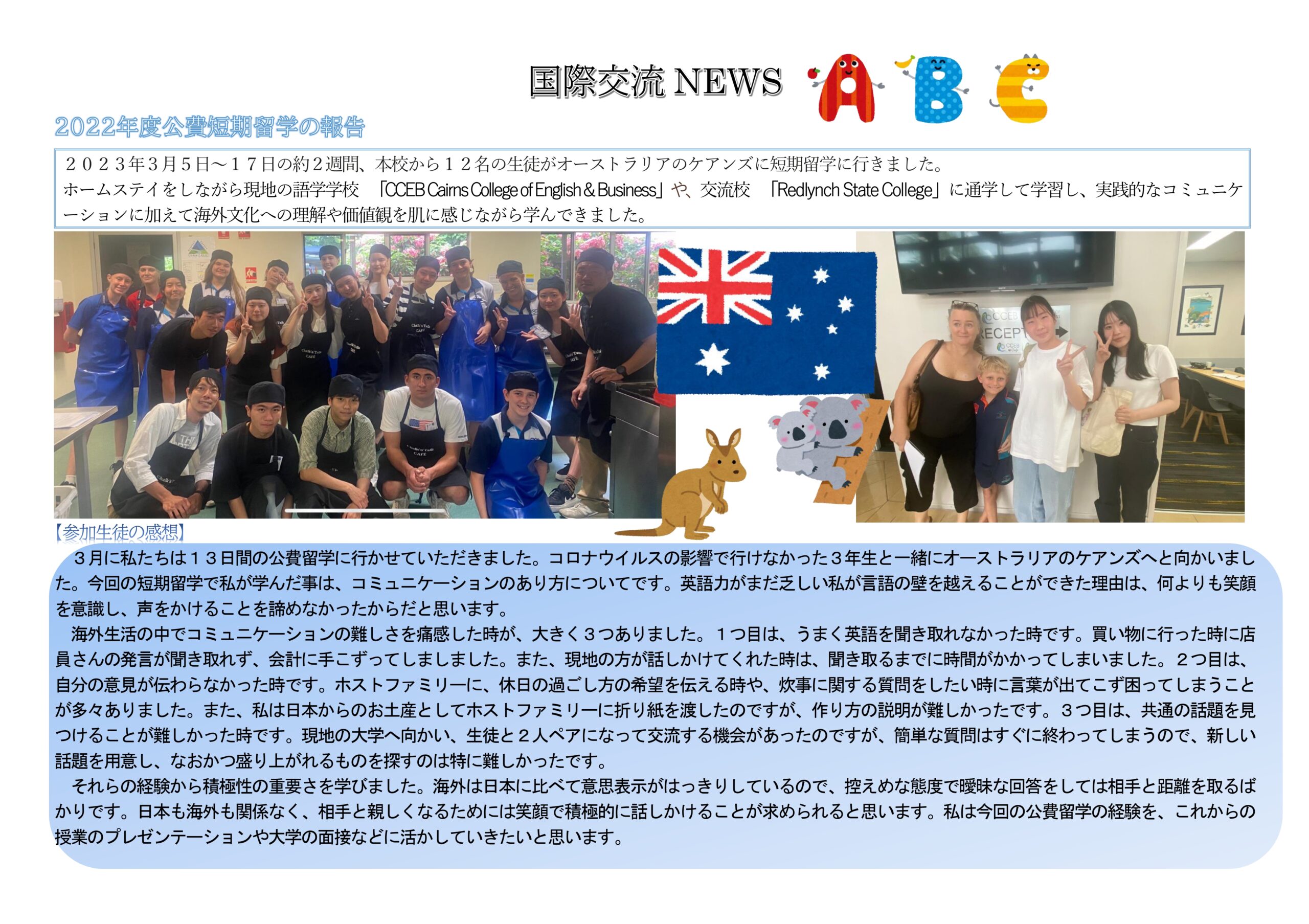 2023年3月5日~17日の約2週間、本校から12名の生徒がオーストラリアのケアンズに短期留学に行きました。