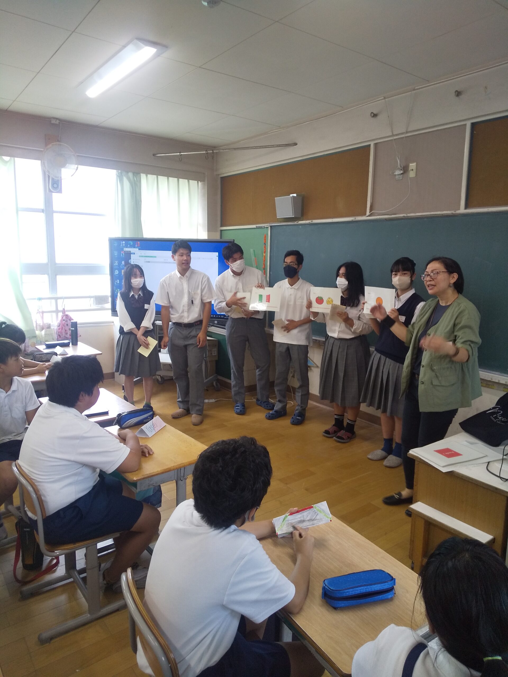 本校教員とAET(外国人教員)4名、本校生徒18名が孔舎衙小学校へ行き、英語の授業を実施しました。