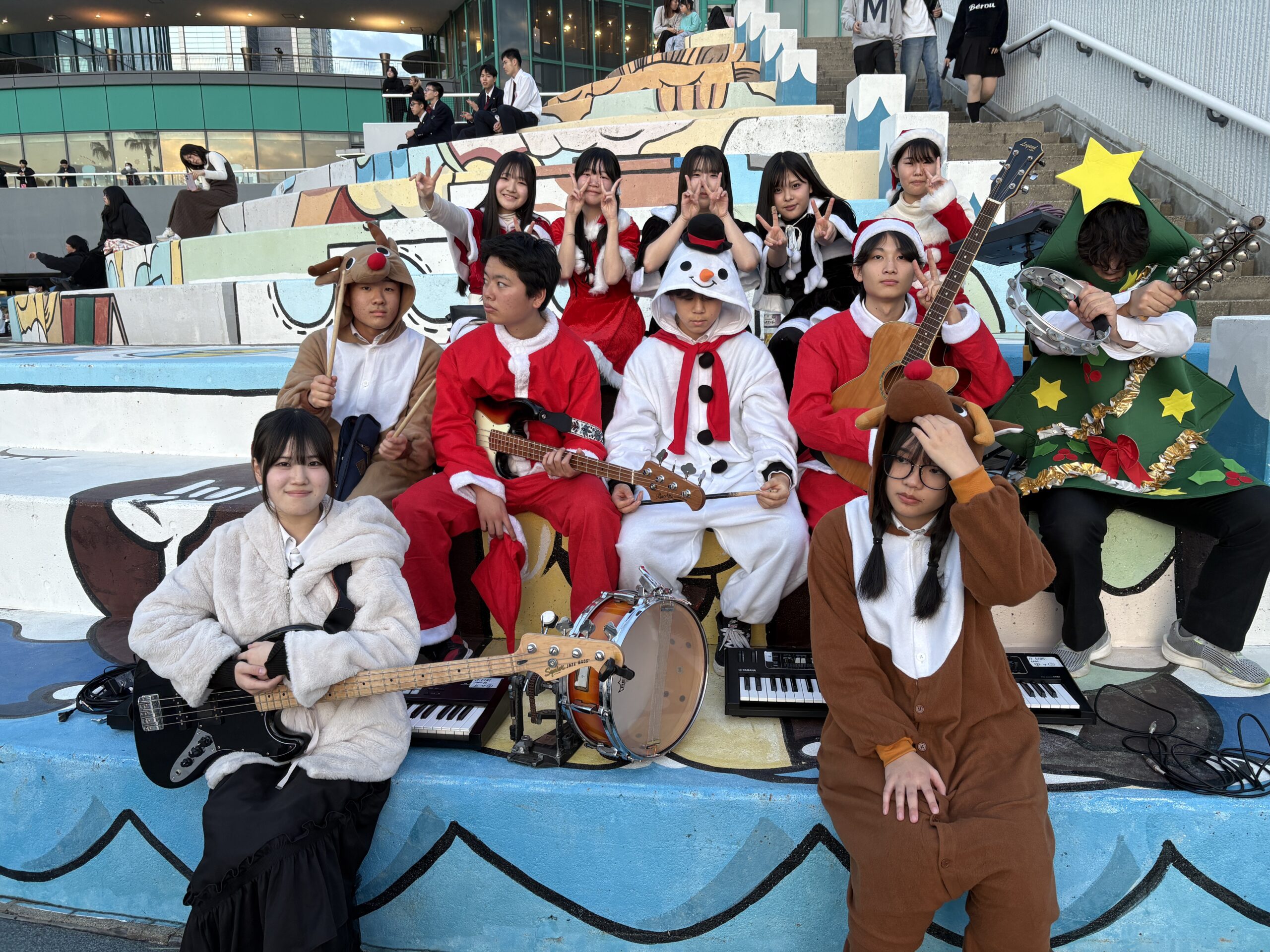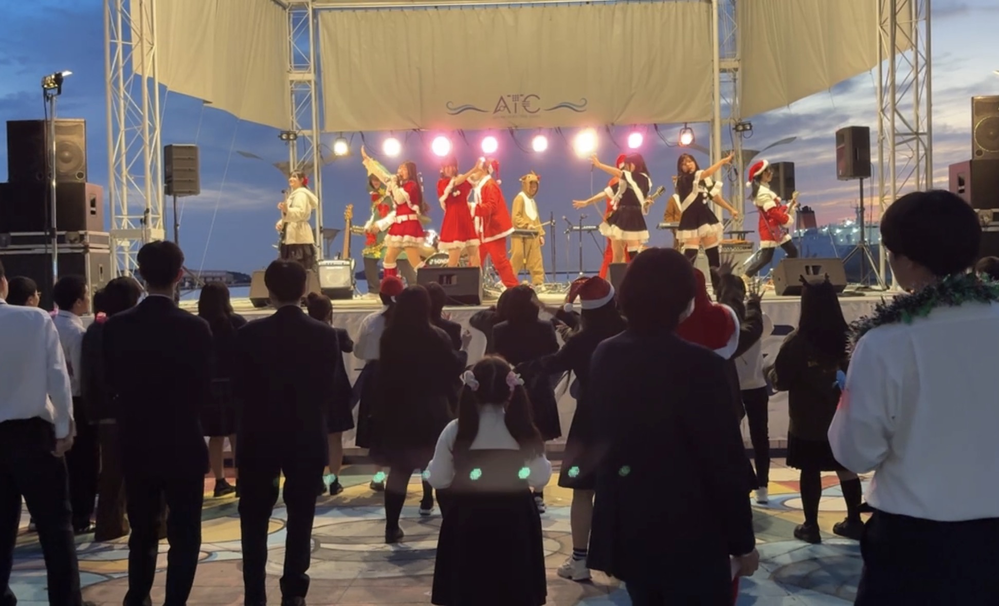 12月の野外の海辺のステージということもあり寒さ対策を考えていましたが、天候に恵まれポカポカ陽気で、暗くなってからはイルミネーションも点灯し、しかもたくさんの方々の前で演奏ができて、しかも会場がおおいに盛り上がってくれたので本当に最高でした。